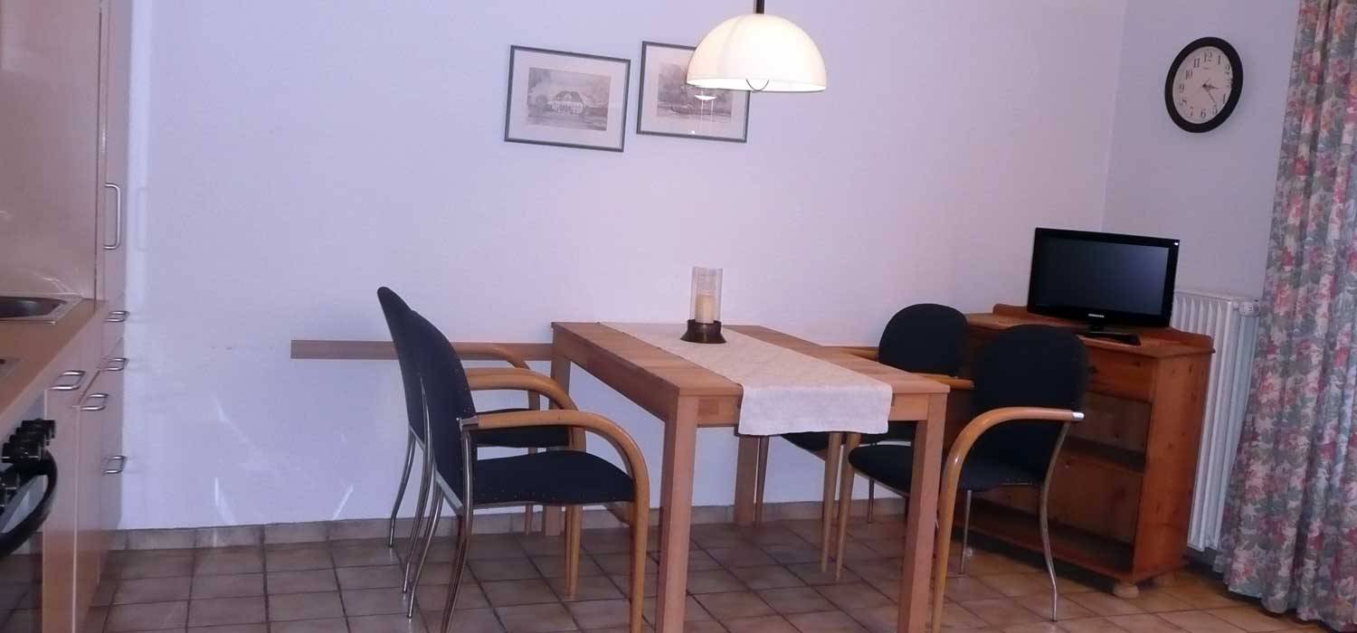 Jede Ferienwohnung besteht aus mindestens zwei Schlafzimmern, Wohnraum mit Sitz- und Essecke, voll ausgestattete Küchenzeile (auch Backofen, Wasserkocher, Geschirrspüler), Dusche/WC, SAT-TV, WLAN, Bettwäsche, Handtücher und bei Bedarf Kleinkinderausstattung.